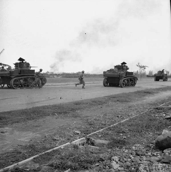 Tentara Inggris dengan sejana jenis Bren berlindung dari serbuan pejuang.